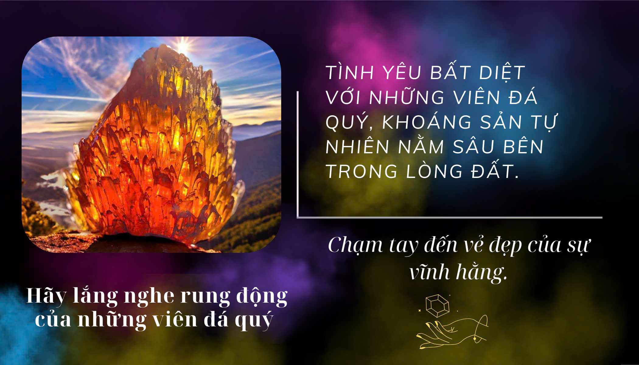 Tinh hoa đá quý hàng đầu Việt Nam kết hợp triết lý phong thuỷ và năng lượng, kiến tạo nên những tác phẩm độc bản đẳng cấp. Mỗi sản phẩm được chế tác thủ công tinh xảo, mang trong mình không chỉ giá trị thẩm mỹ, mà còn là dấu ấn cá tính và nguồn năng lượng bảo chứng uy tín.